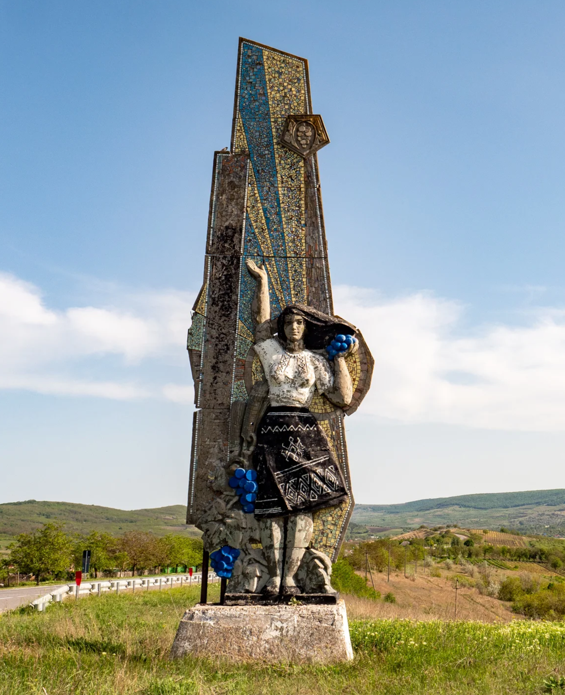 Driving off the beaten path, the traveller comes across numerous well-crafted Soviet-era road signs. Like large, imposing concrete sculptures, they have stood for decades, marking sovkhozes, rayons, and towns. Hammers and sickles, ears of corn, red stars, and collective farm women carrying grapes emerge amid gentle green hills and long, dusty roads.